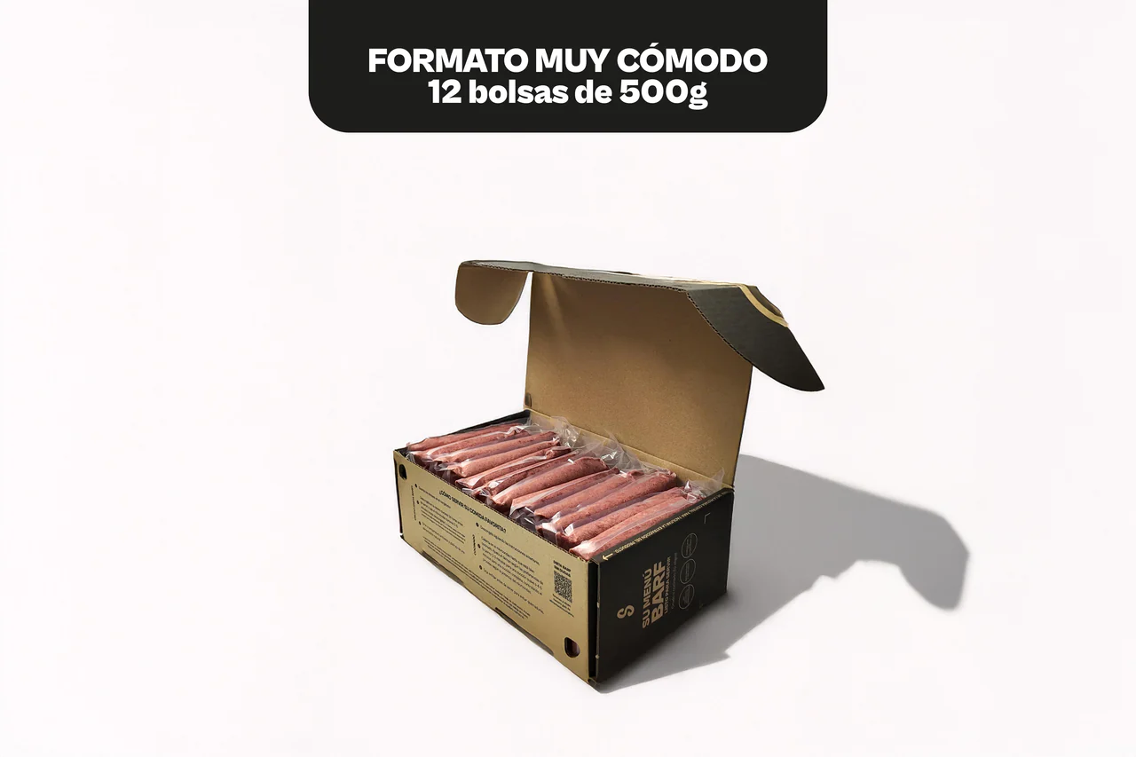Caja con 12 bolsas de 500 g listas para usar. Puedes servir el menú crudo directamente o templarlo ligeramente para potenciar el aroma y la palatabilidad.